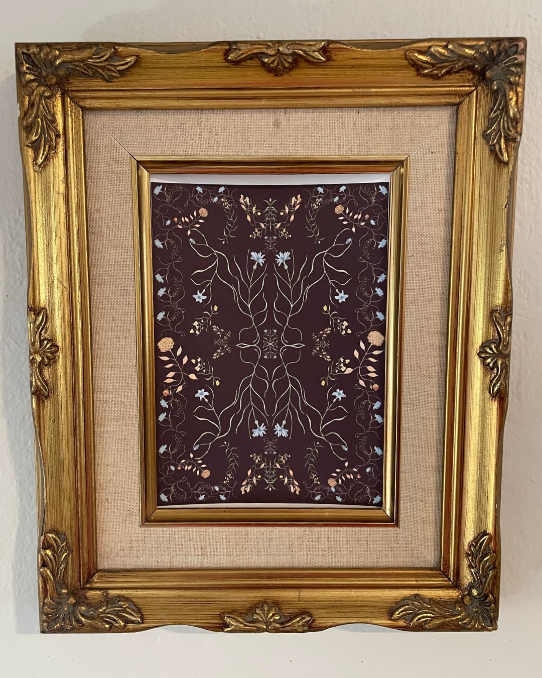 A warm maroon background enhances the delicate beauty that only a fall landscape can provide in the intricate movement of ordinary flowers.